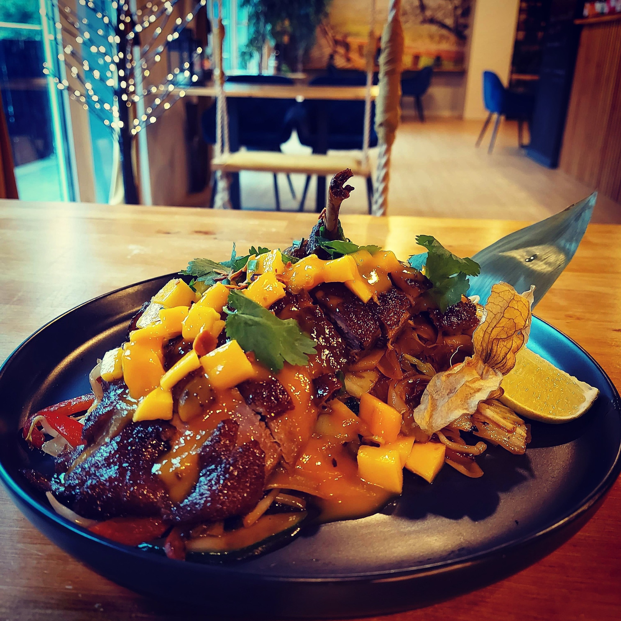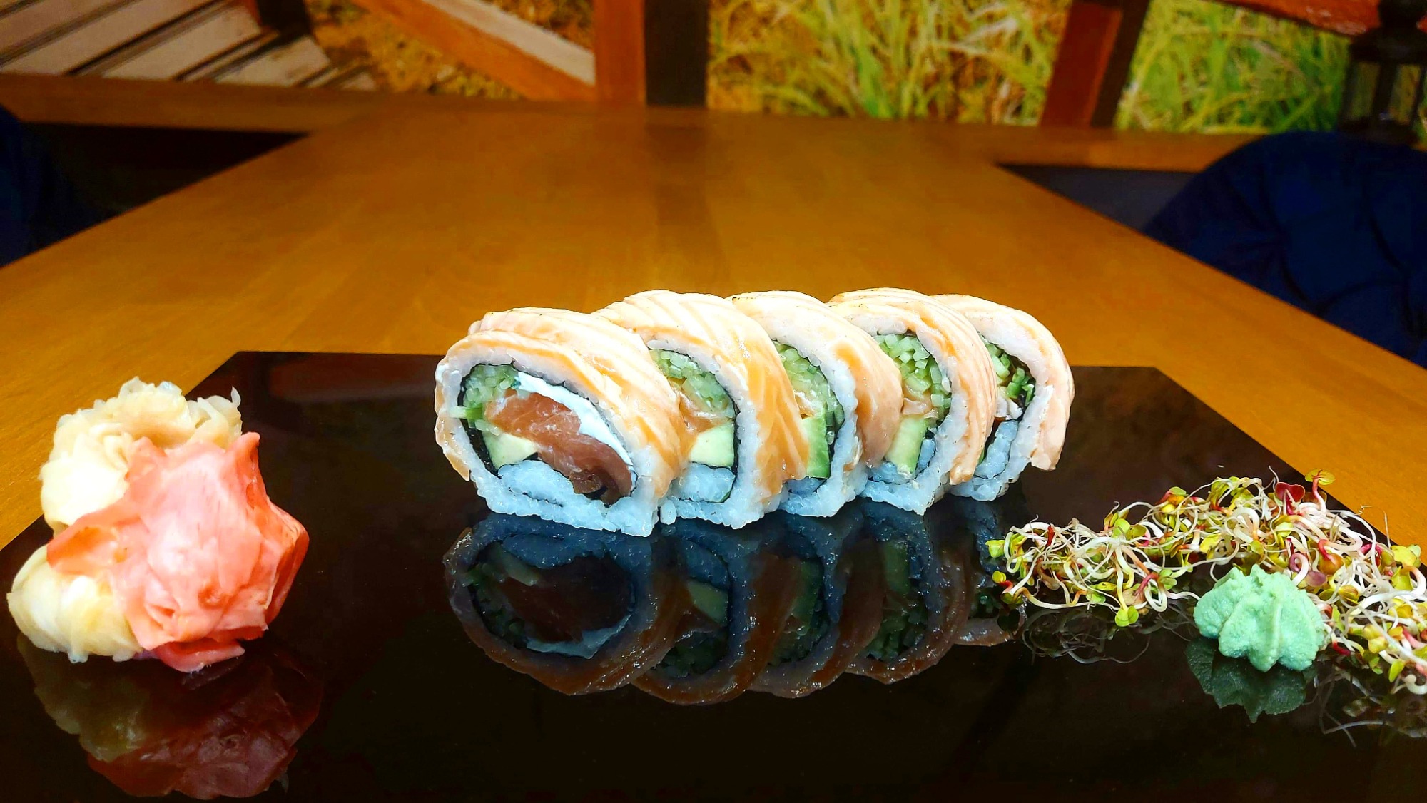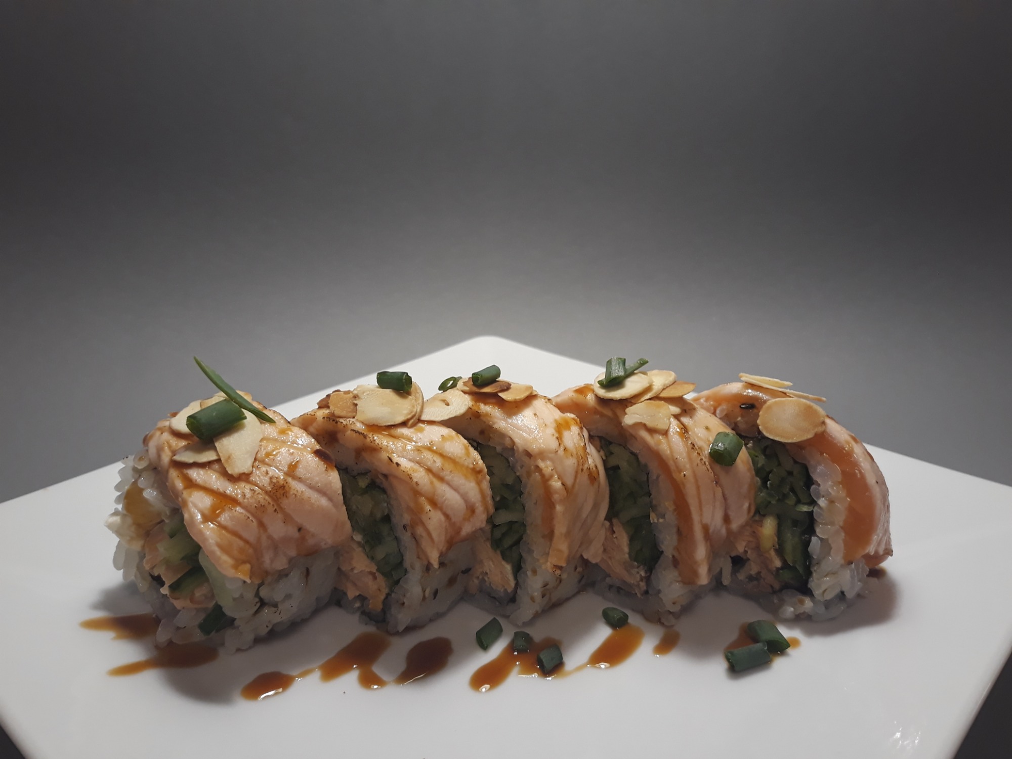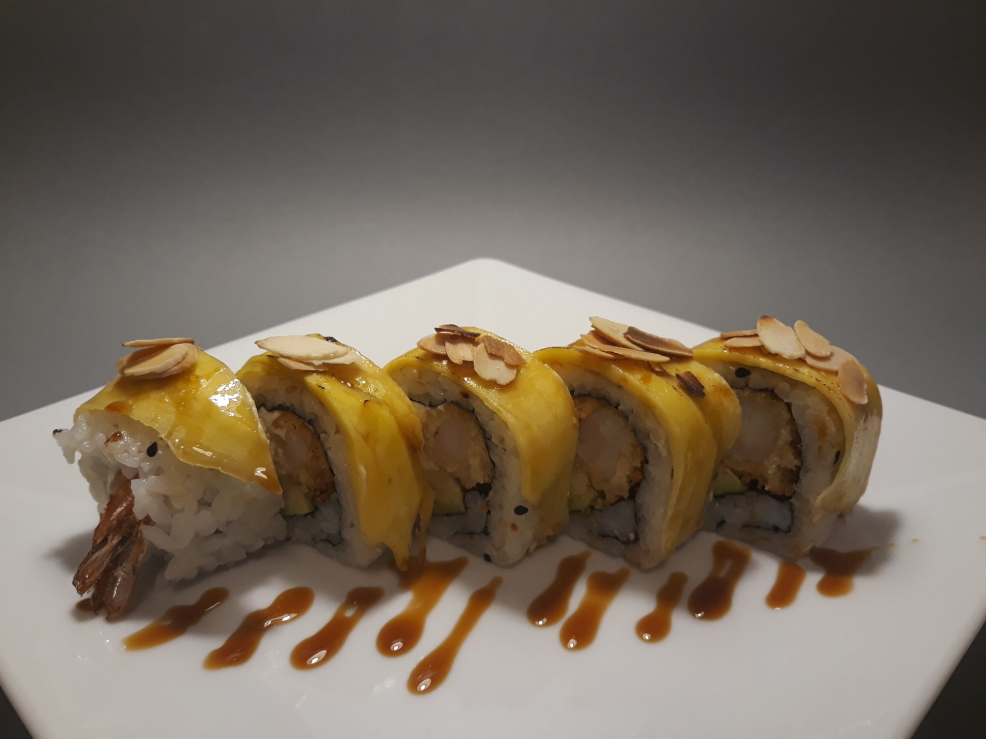 grillowany łosoś , serek ,awokado ,obłożone mango ,pulpa mango, teryak , migdały prażone -
