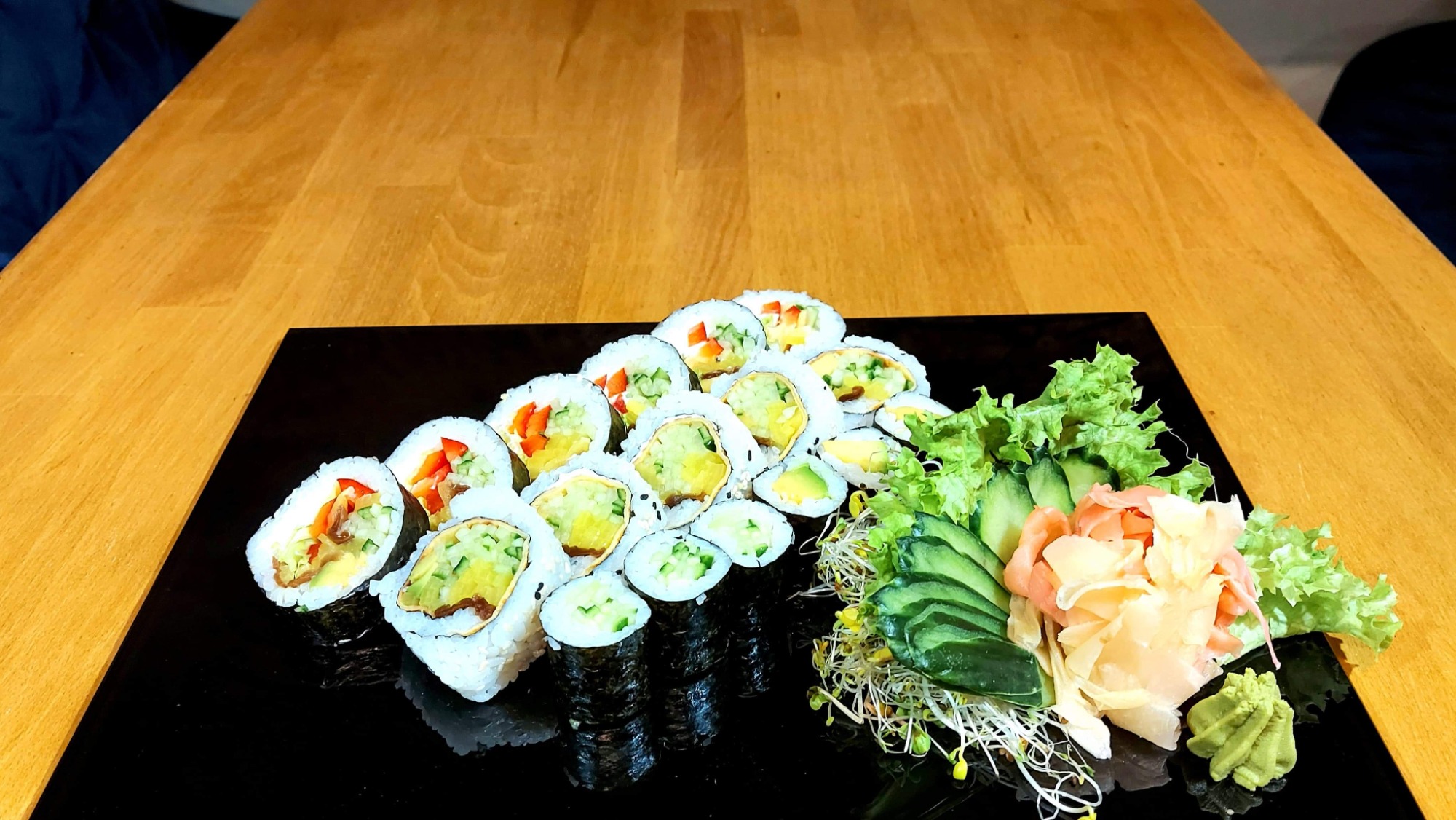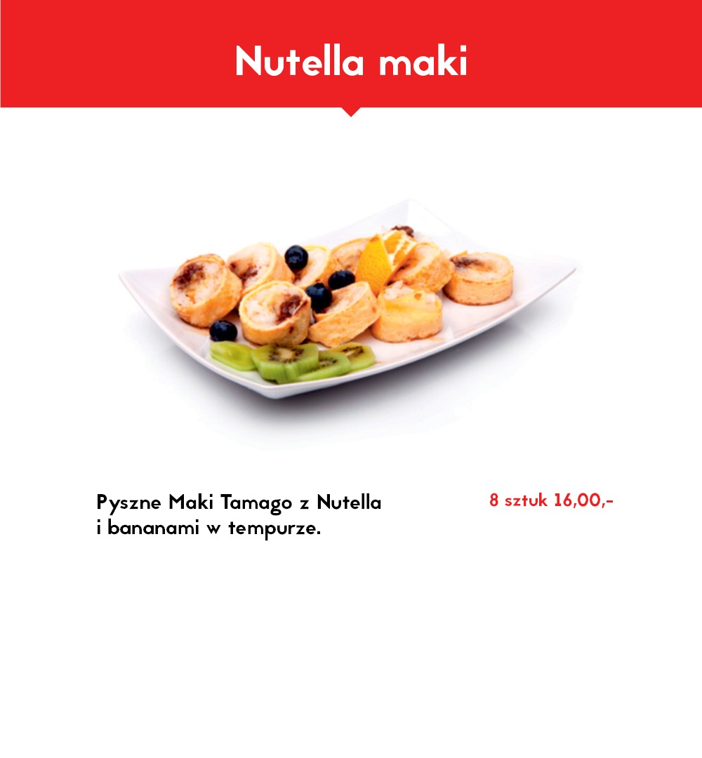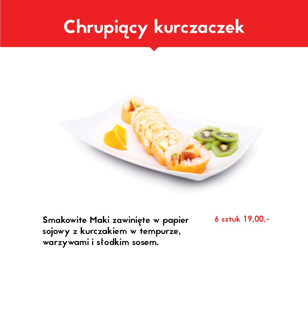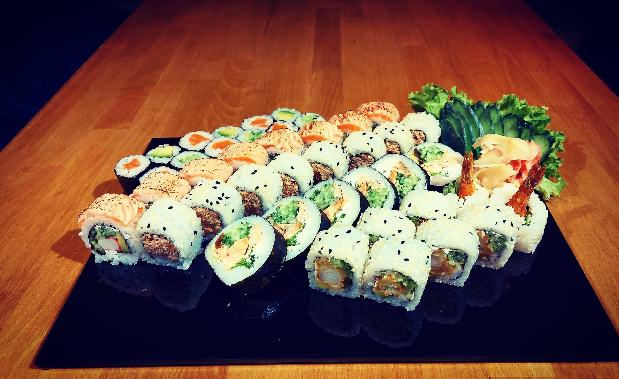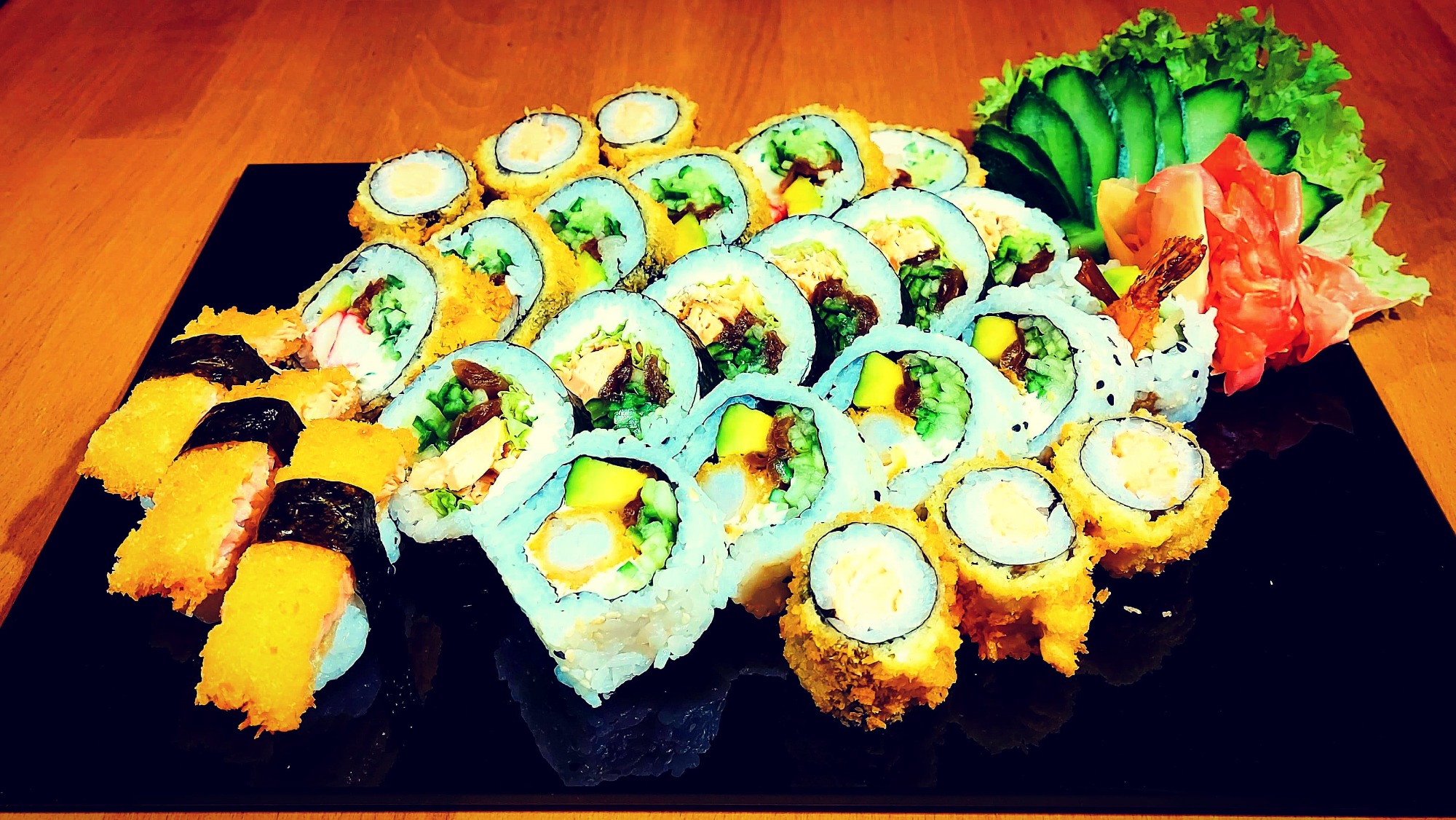 California chrupiąca krewetka obłożona tatarem z łososia 8 szt, Futomak ryba maślana w tempurze 6 szt, California surimi obłożona krewetką i tobiko 8 szt, Futomak z kalmarem w tempurze 6 szt, California grill łosoś obłożona mango 8 szt, Tamago grillowany łosoś 6 szt, Futomak łosoś 6 szt, Hosomak ogórek 6 szt, Hosomak tykwa - rolka w tempurze 6 szt.