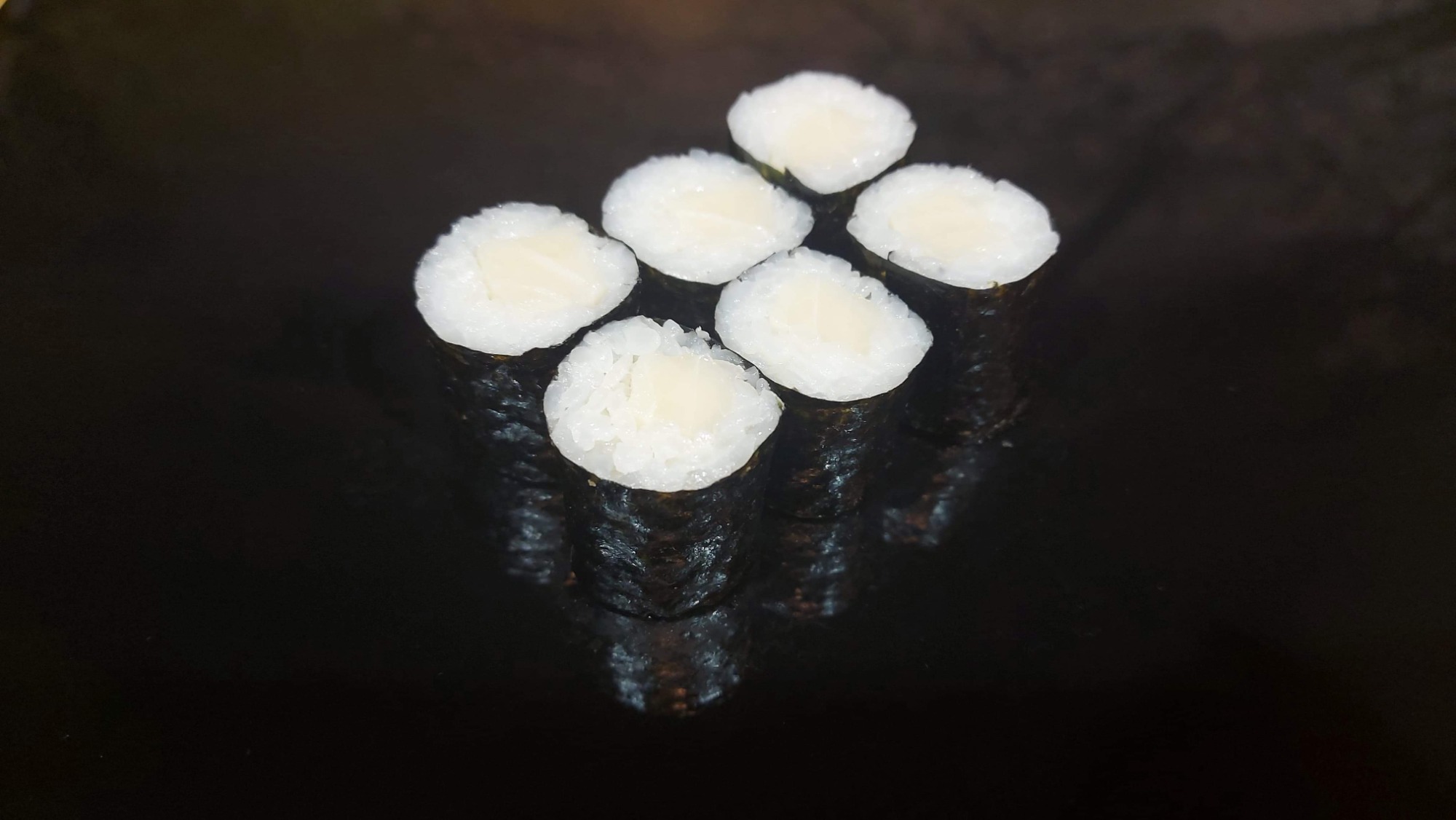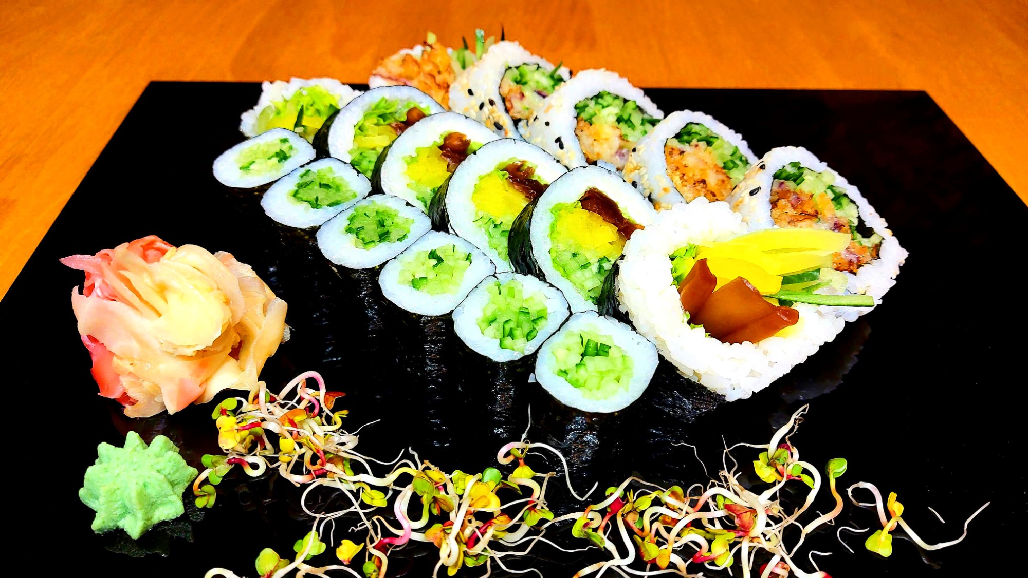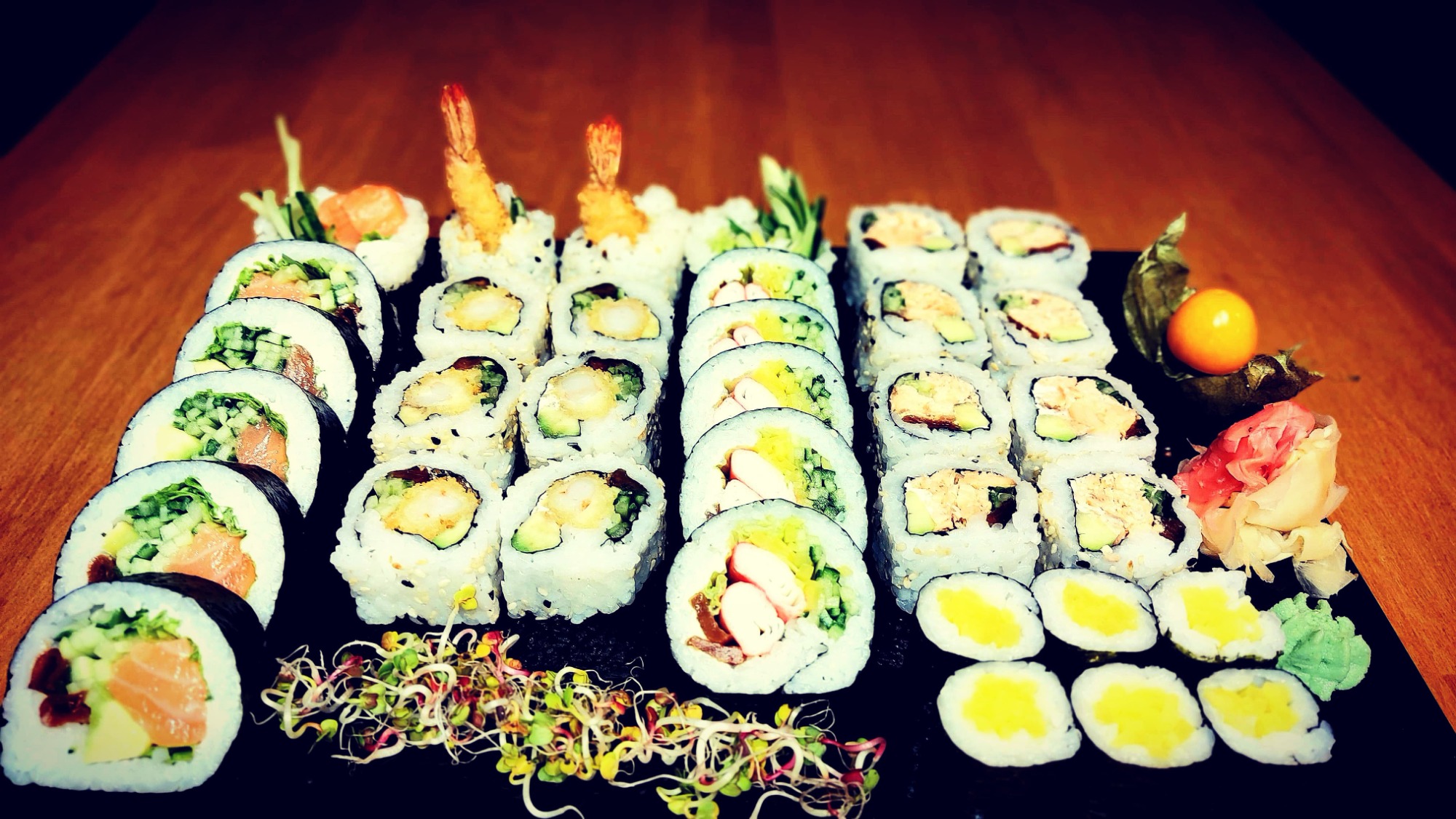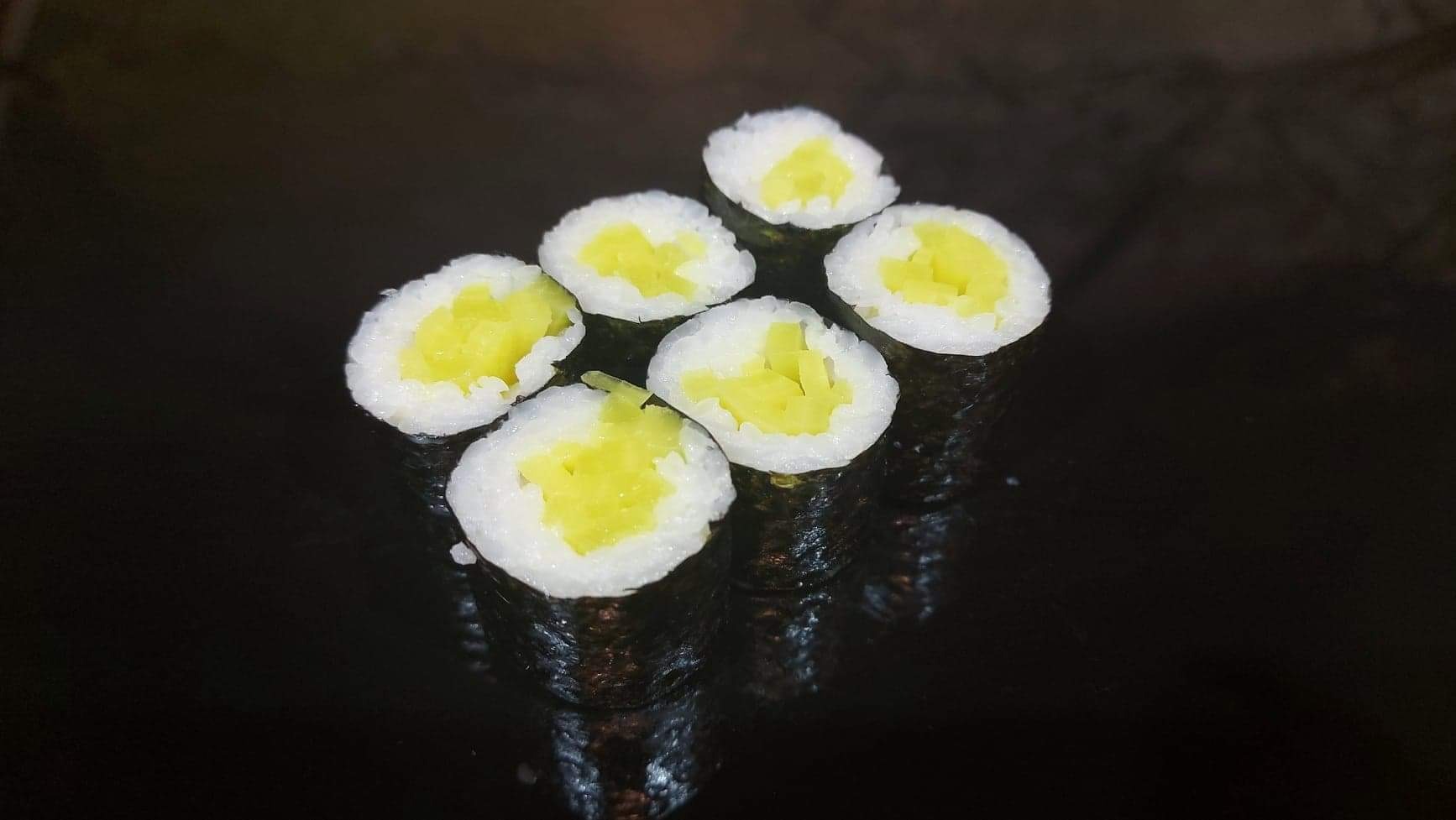 California chrupiąca krewetka obłożona tatarem z łososia 8 szt, Futomak ryba maślana w tempurze 6 szt, California surimi obłożona krewetką i tobiko 8 szt, Futomak z kalmarem w tempurze 6 szt, California grill łosoś obłożona mango 8 szt, Tamago grillowany łosoś 6 szt, Futomak łosoś 6 szt, Hosomak ogórek 6 szt, Hosomak tykwa - rolka w tempurze 6 szt.
