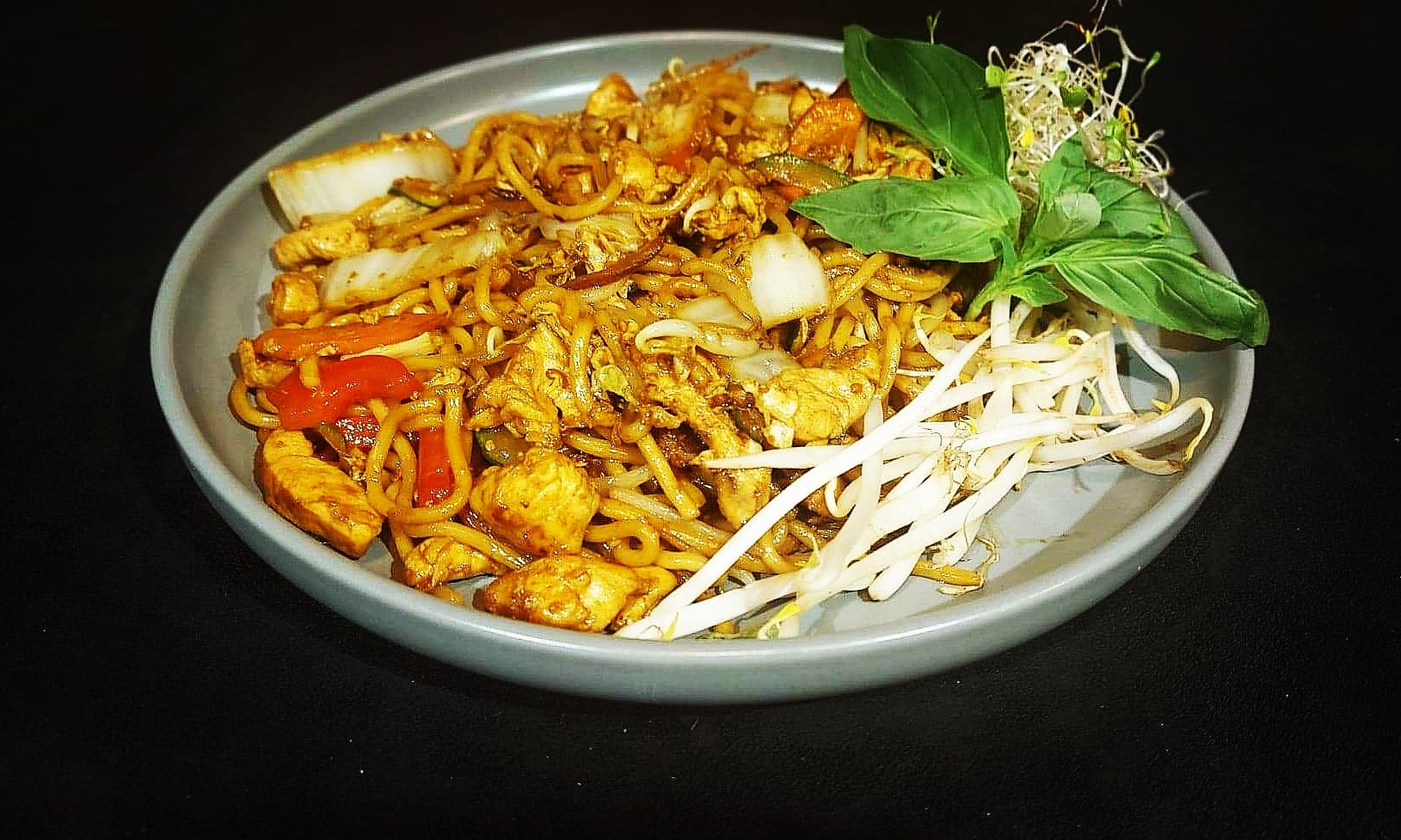 makaron ryżowy, sos tamaryndowy, jajko, kurczak, kiełki fasoli mung, świeże warzywa, orzeszki arachidowe, płatki chilli, świeża kolendra, limonka. -