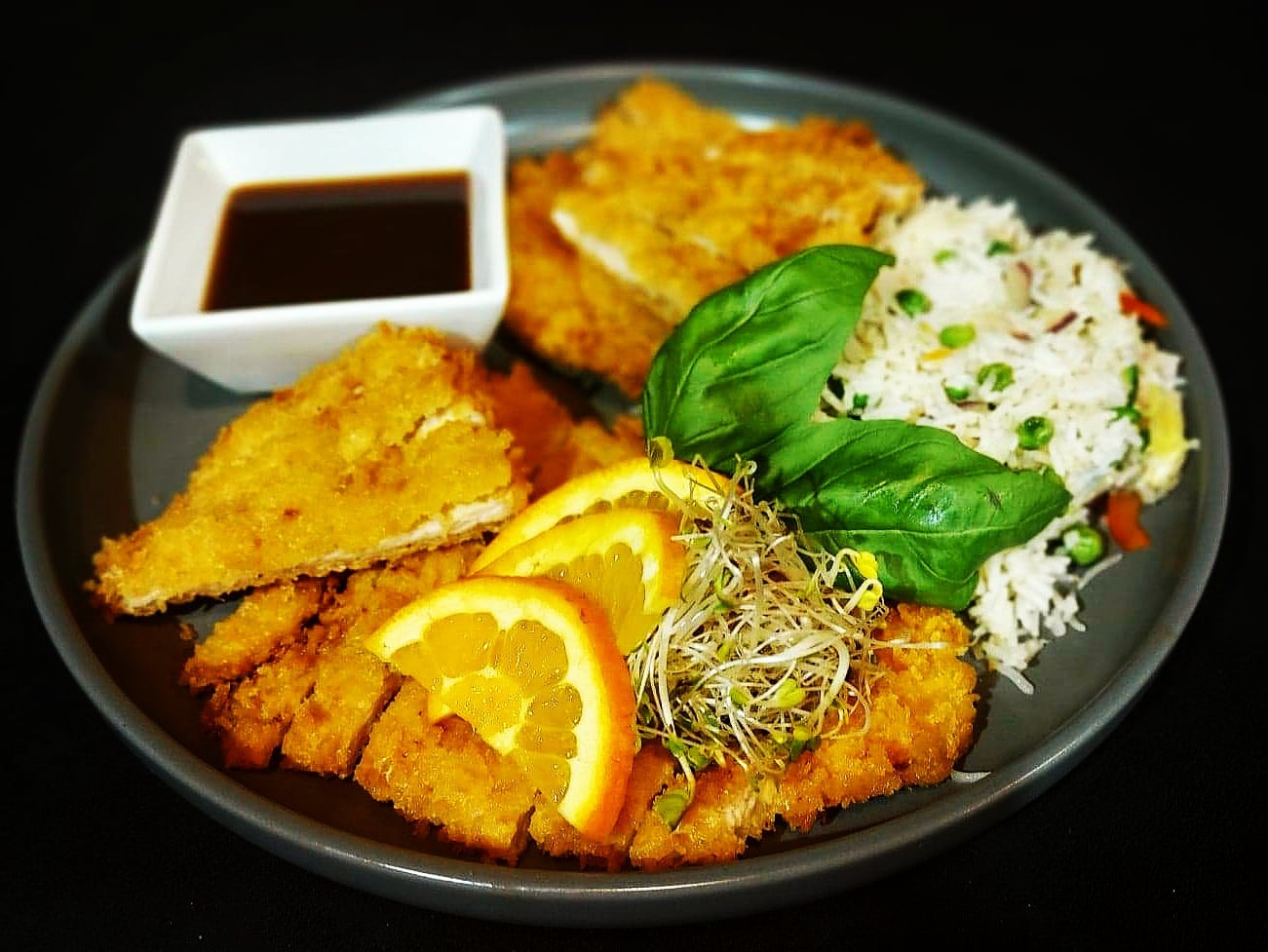 Kawałki łososia w panierce podawane z ryżem i dressingiem