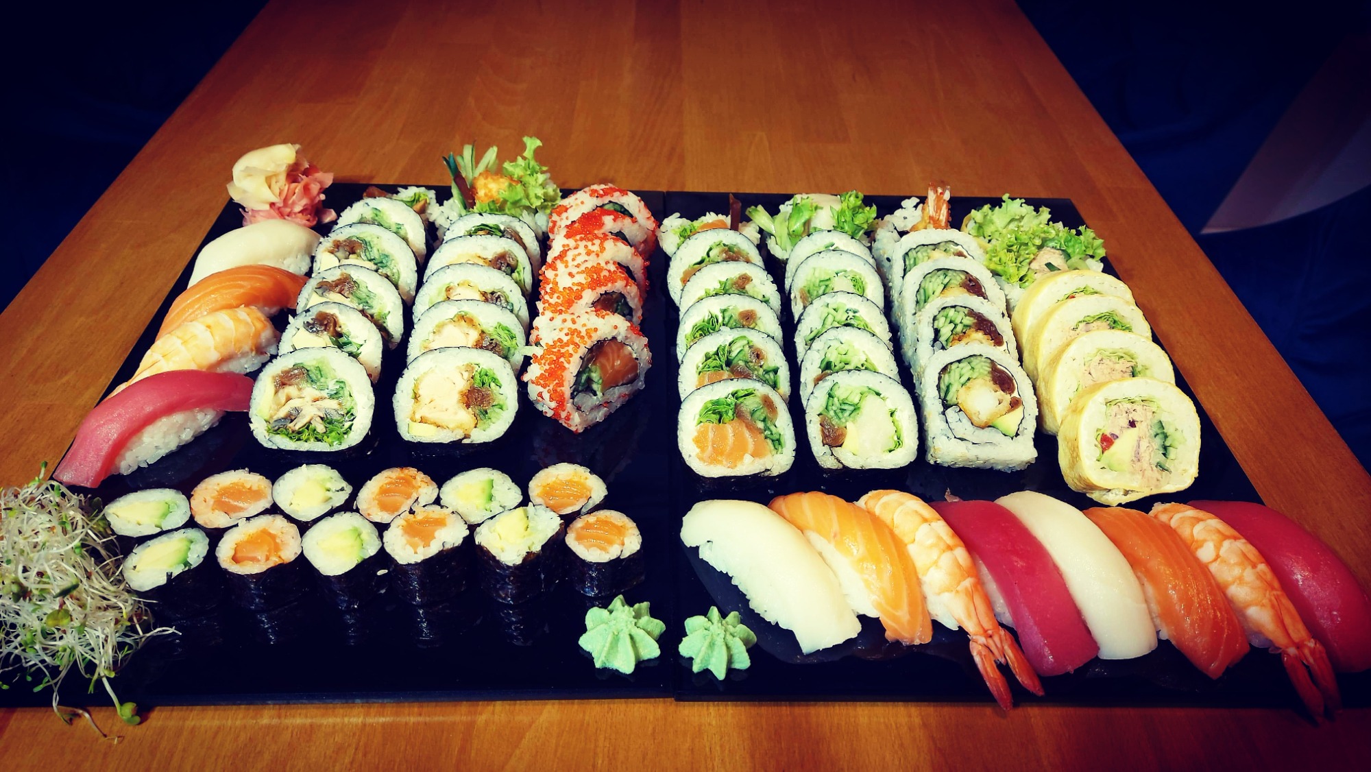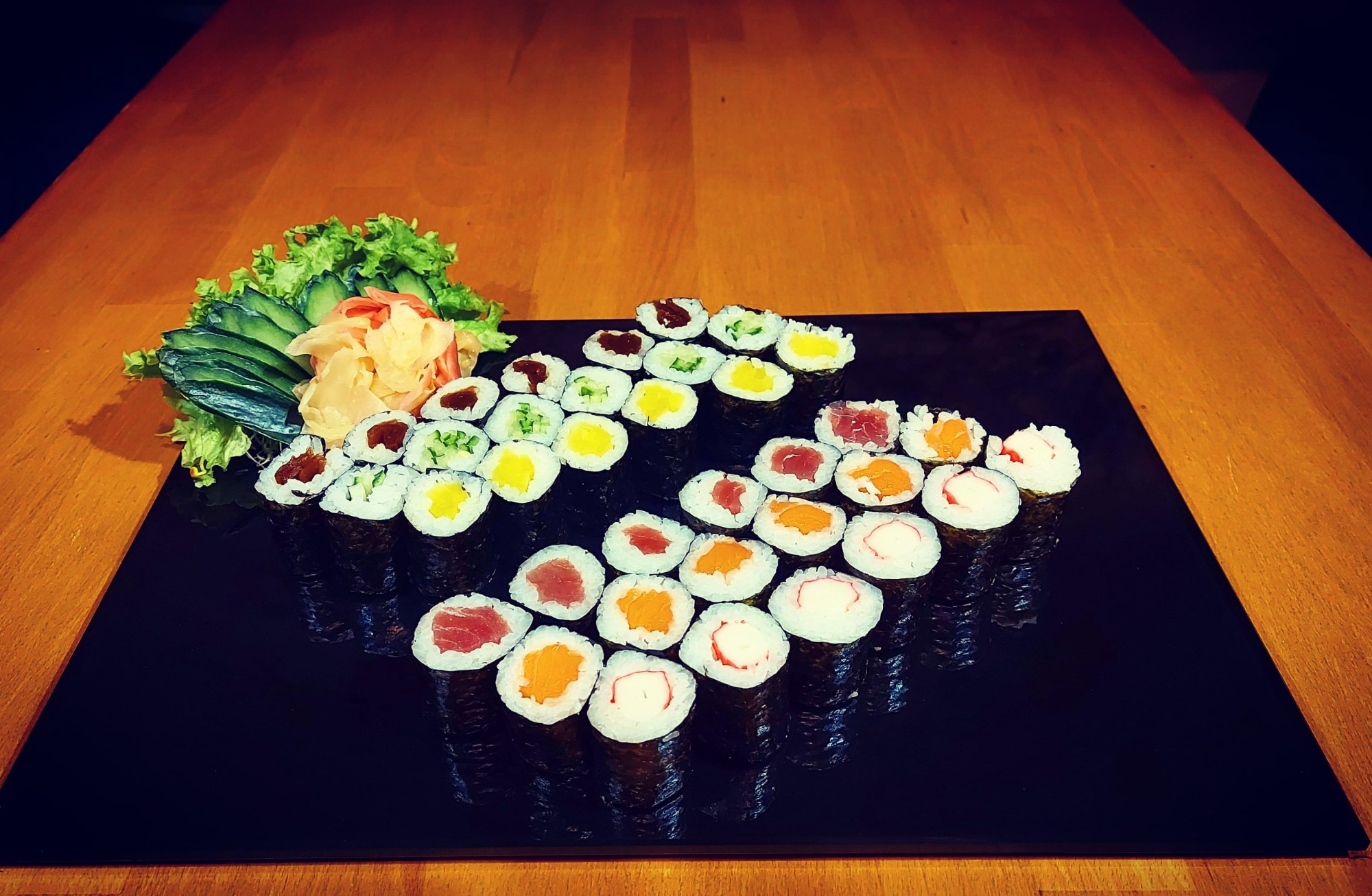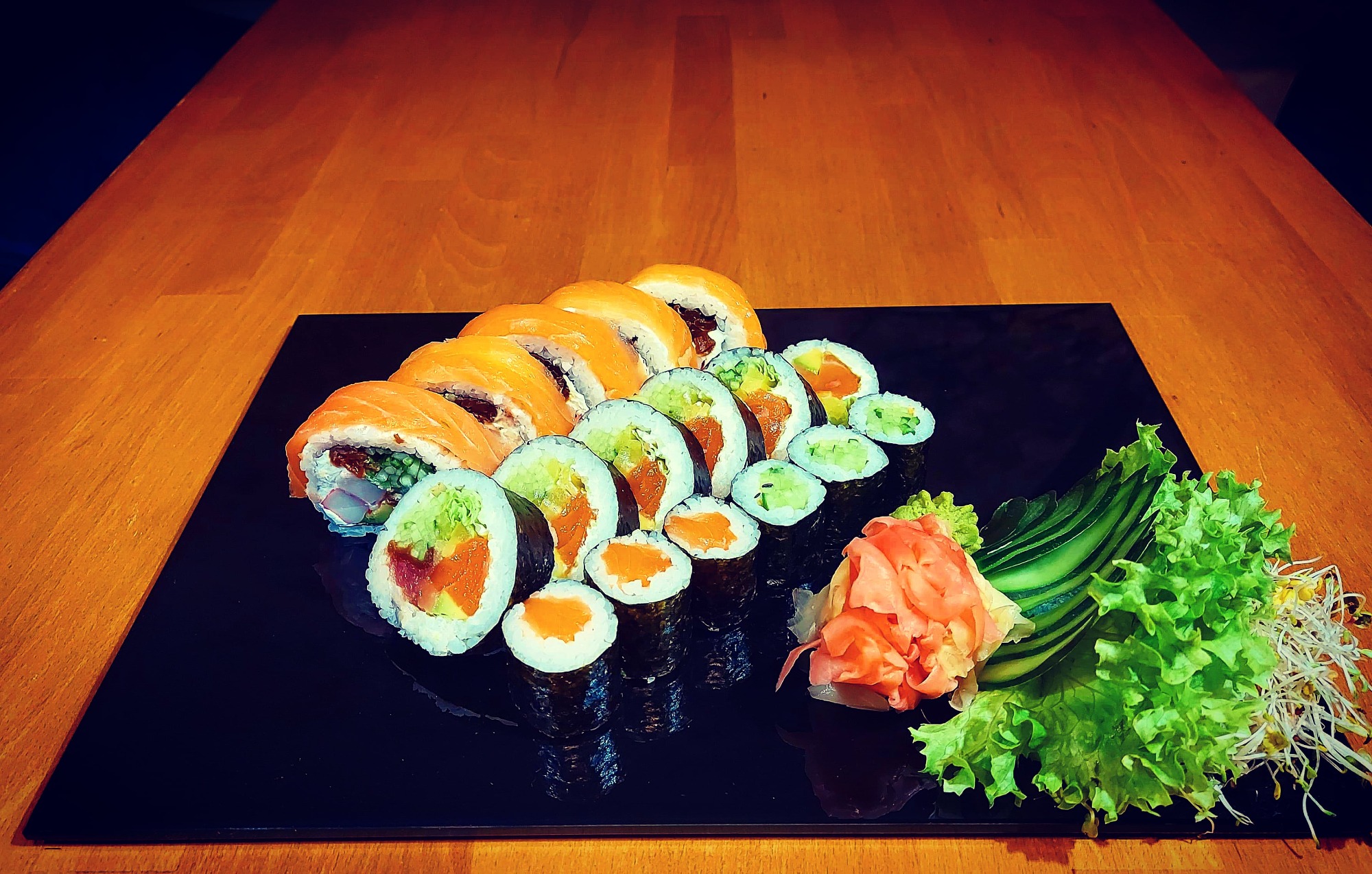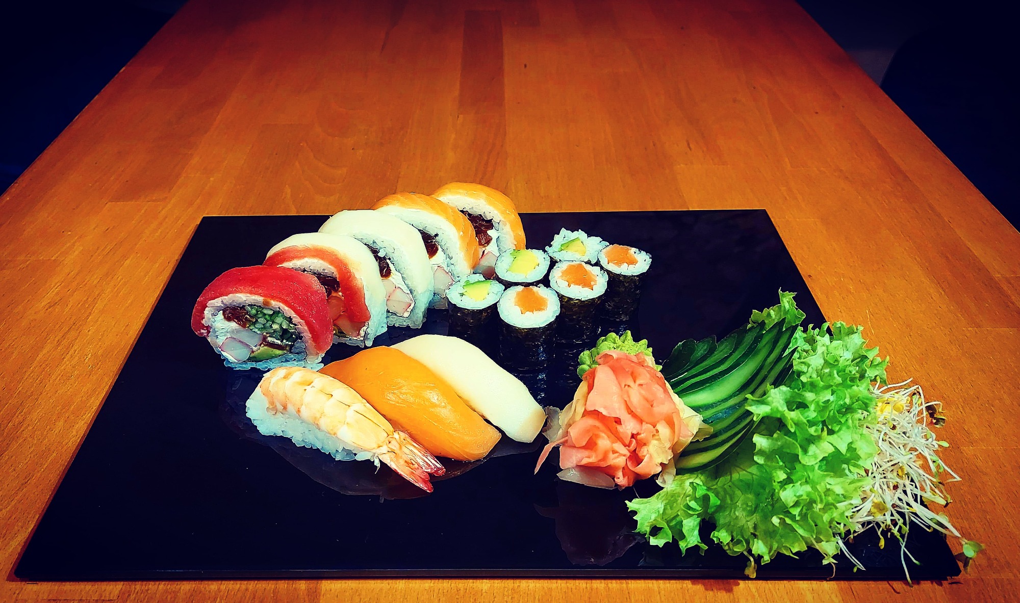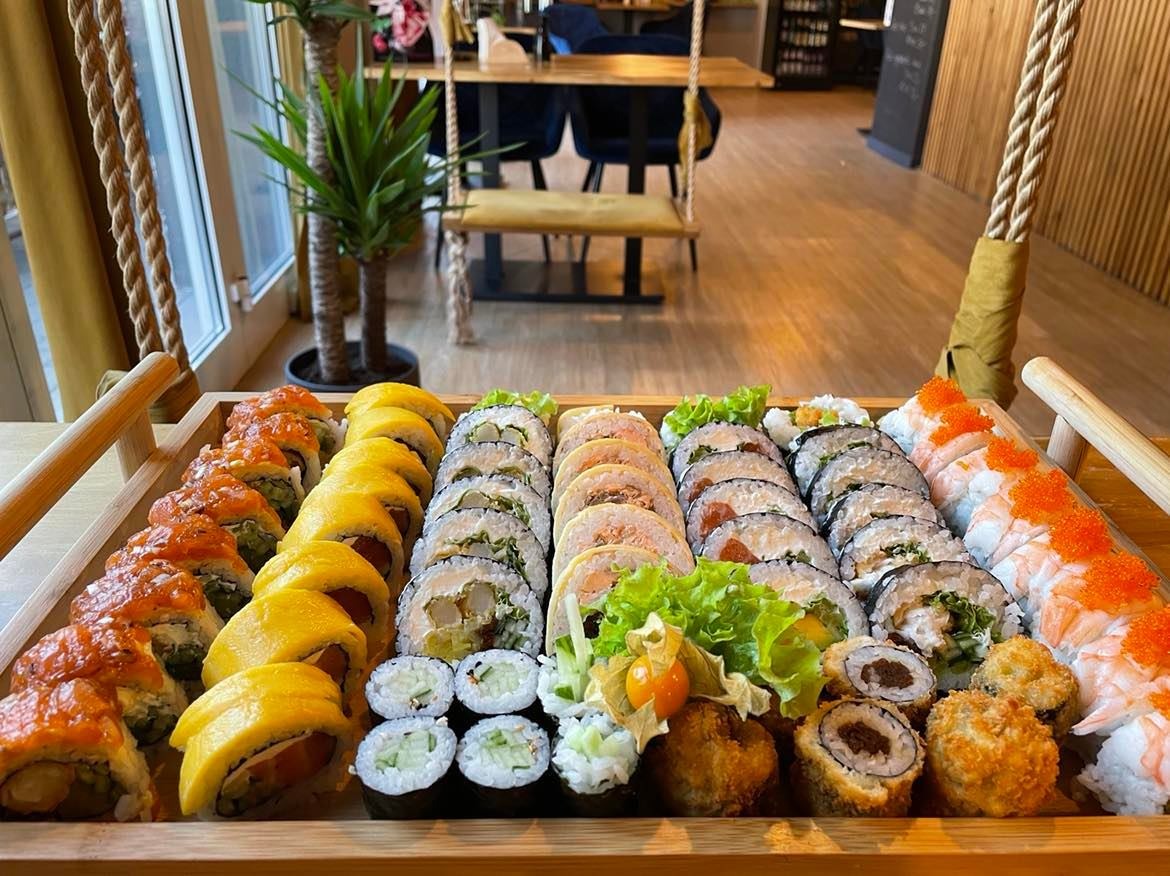 Nigiri łosoś 3 szt., Nigiri tuńczyk 3 szt., Nigiri krewetka 3 szt.,Nigiri ryba maślana 3 szt.,Futomaki łosoś 6 szt., Philadelphia maki łosoś w tempurze 6 szt., Tamago maki pasta z tuńczyka 6 szt., Futomaki grillowany węgorz 6 szt., Hosomaki awokado 6 szt., Hosomaki łosoś na ostro 6 szt., California gold 5 szt., California krewetka w tempurze 5 szt., California łosoś z kawiorem na zewnątrz 5 szt., Futomaki ryba maślana 6 szt. -