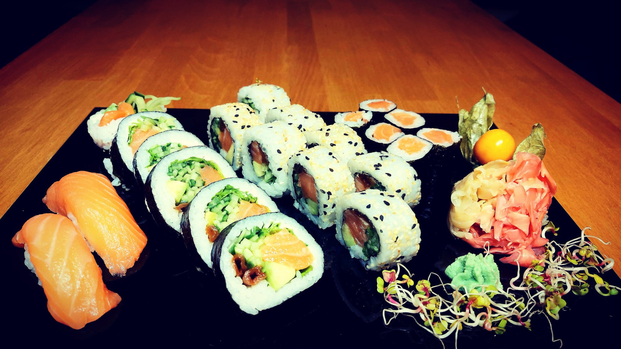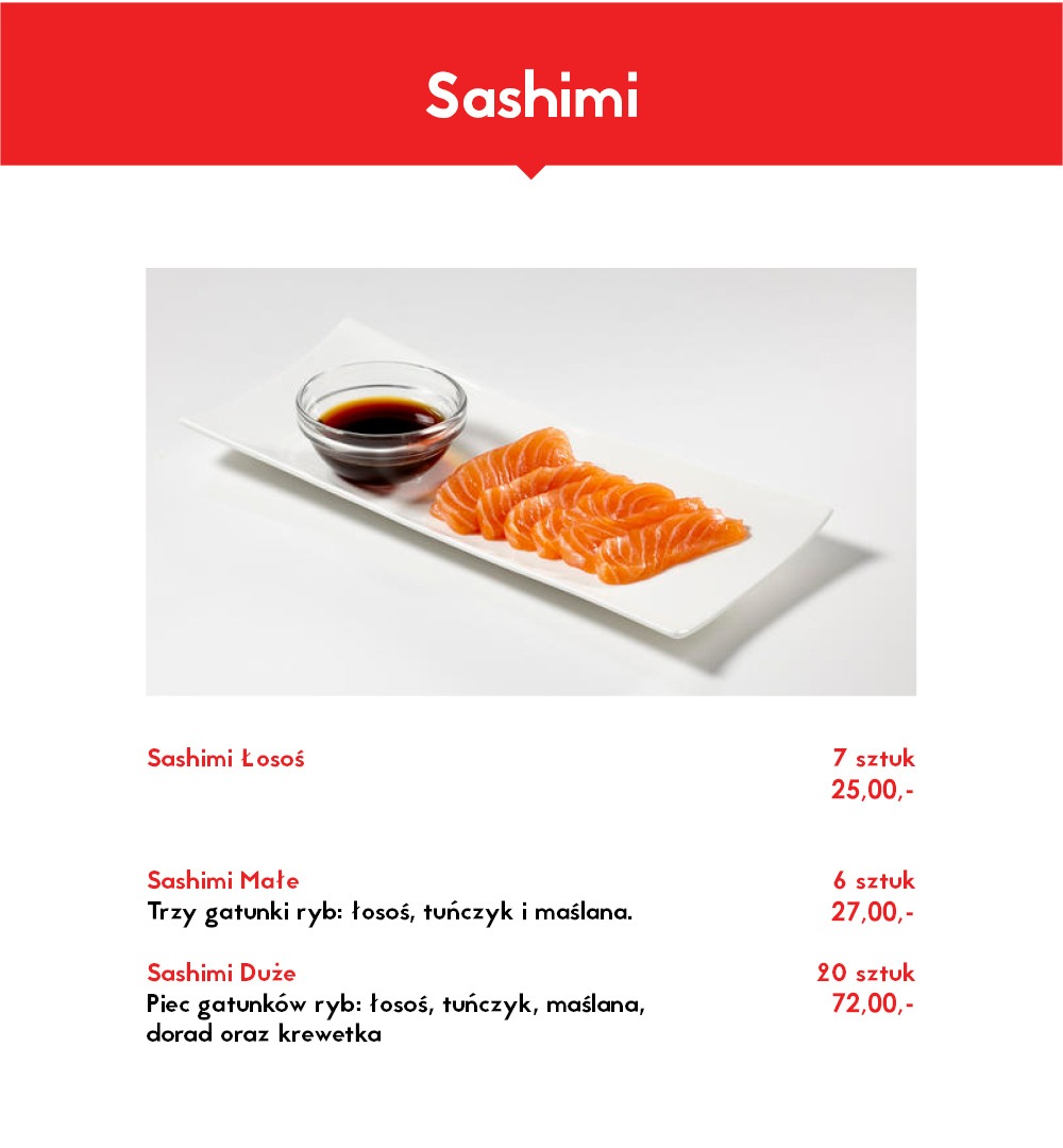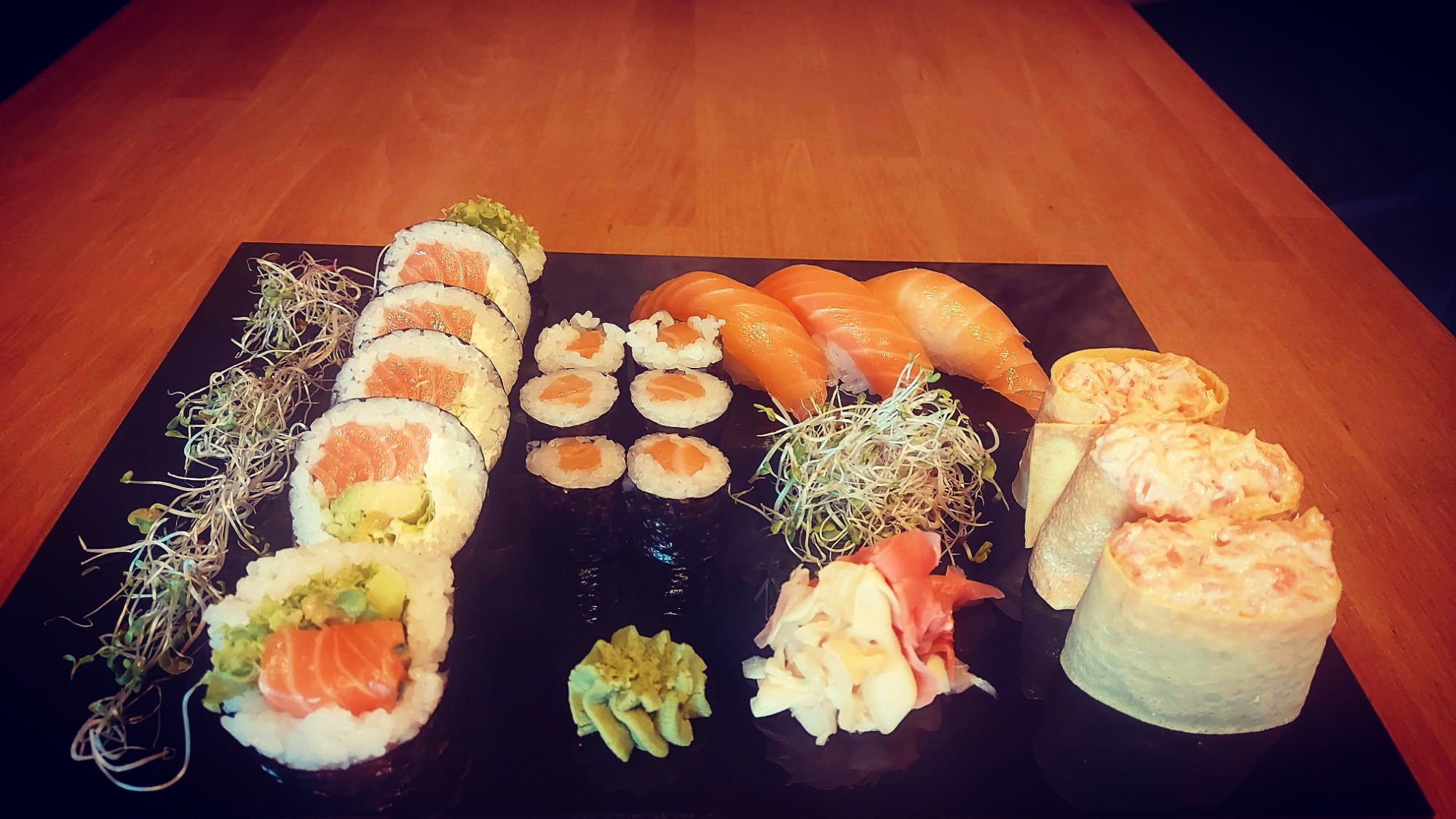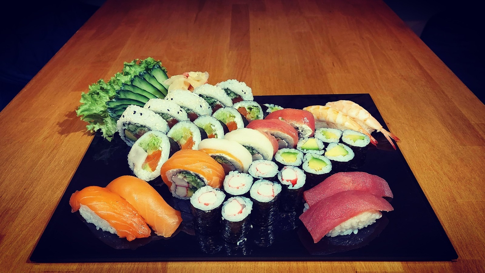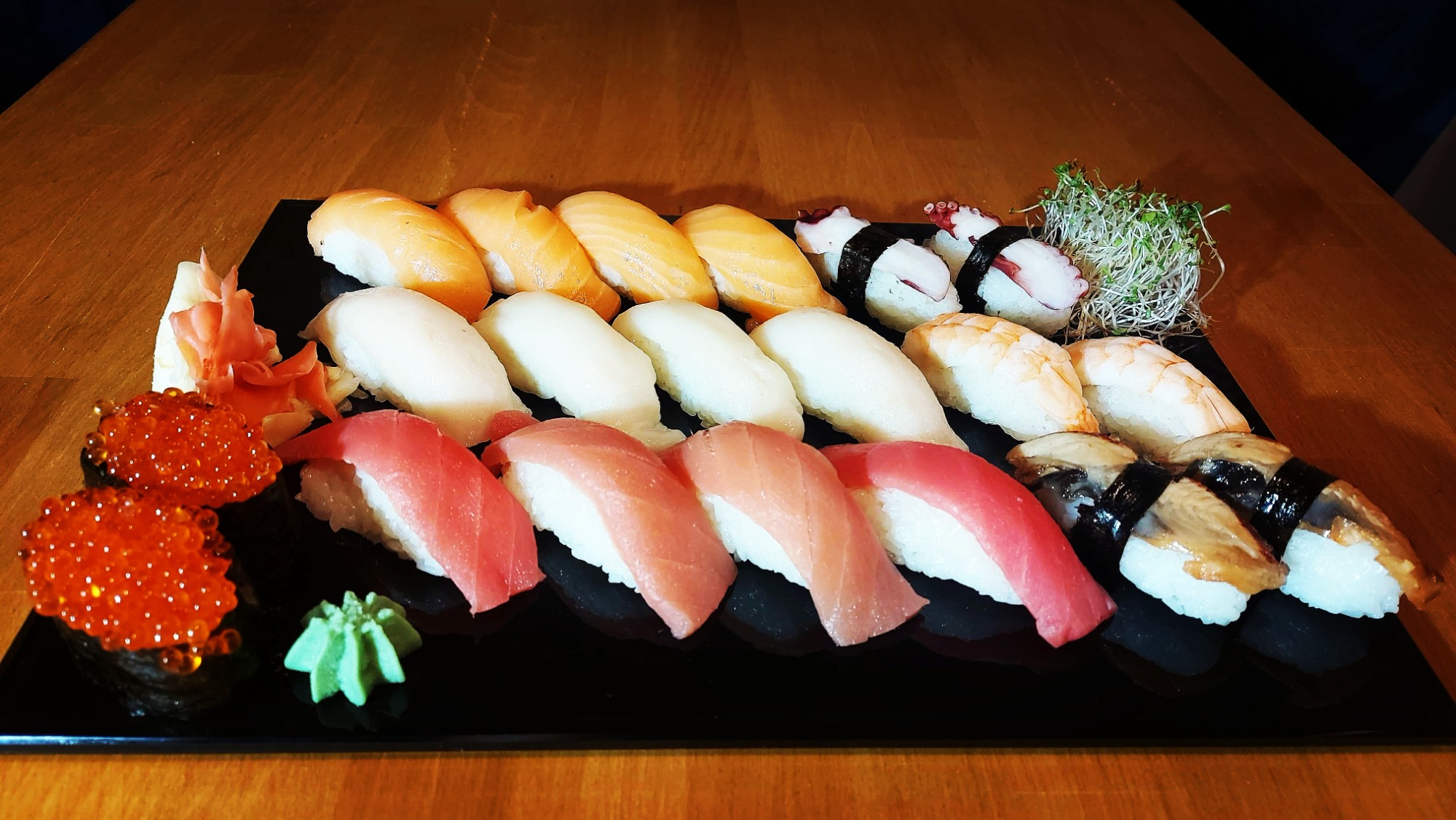 Nigiri łosoś 3 szt., Nigiri tuńczyk 3 szt., Nigiri krewetka 3 szt.,Nigiri ryba maślana 3 szt.,Futomaki łosoś 6 szt., Philadelphia maki łosoś w tempurze 6 szt., Tamago maki pasta z tuńczyka 6 szt., Futomaki grillowany węgorz 6 szt., Hosomaki awokado 6 szt., Hosomaki łosoś na ostro 6 szt., California gold 5 szt., California krewetka w tempurze 5 szt., California łosoś z kawiorem na zewnątrz 5 szt., Futomaki ryba maślana 6 szt. -