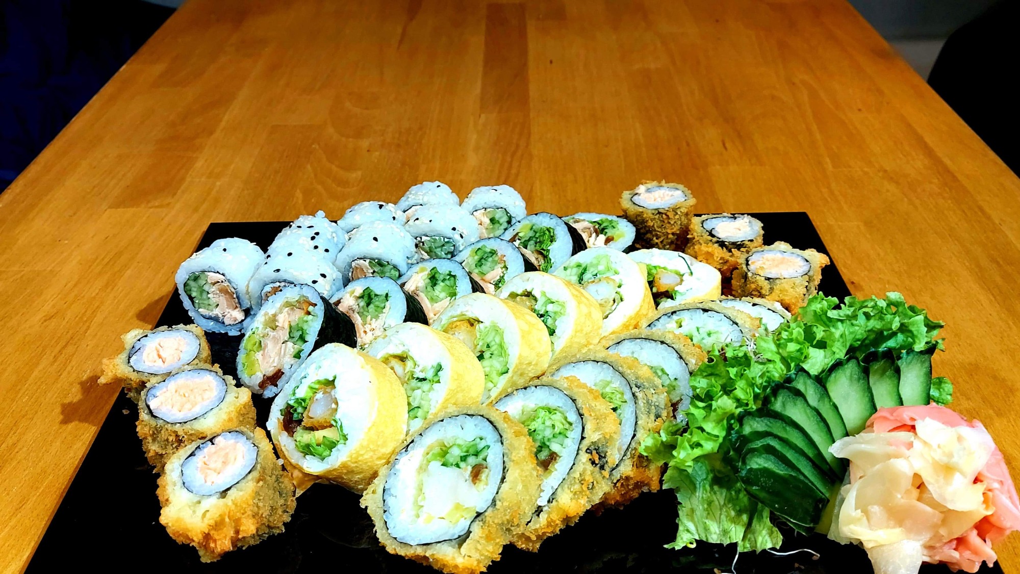California chrupiąca krewetka obłożona tatarem z łososia 8 szt, Futomak ryba maślana w tempurze 6 szt, California surimi obłożona krewetką i tobiko 8 szt, Futomak z kalmarem w tempurze 6 szt, California grill łosoś obłożona mango 8 szt, Tamago grillowany łosoś 6 szt, Futomak łosoś 6 szt, Hosomak ogórek 6 szt, Hosomak tykwa - rolka w tempurze 6 szt. -
