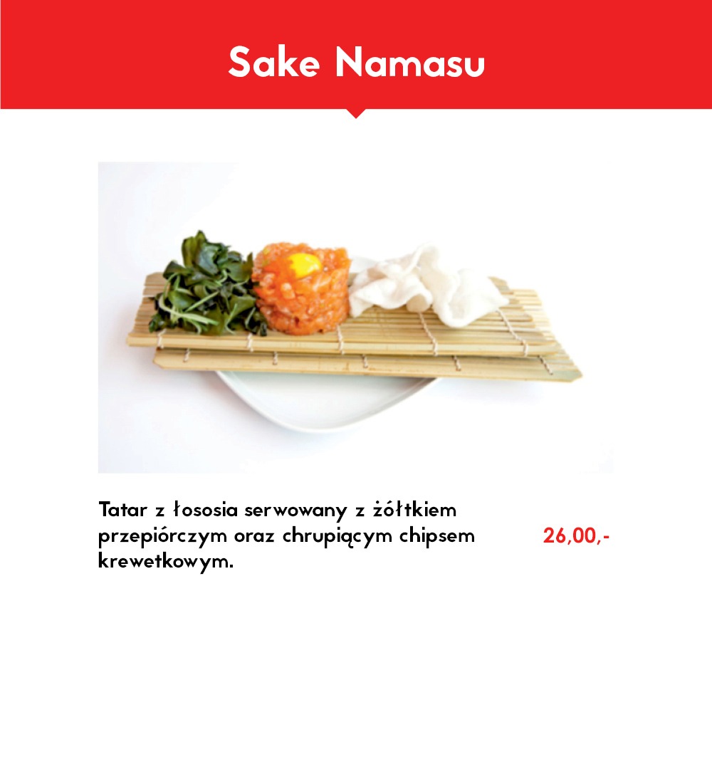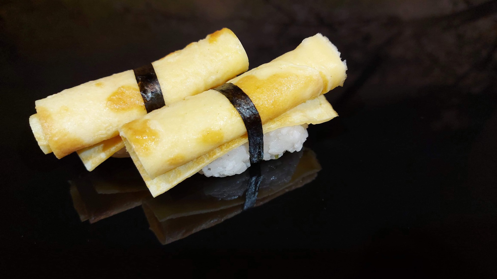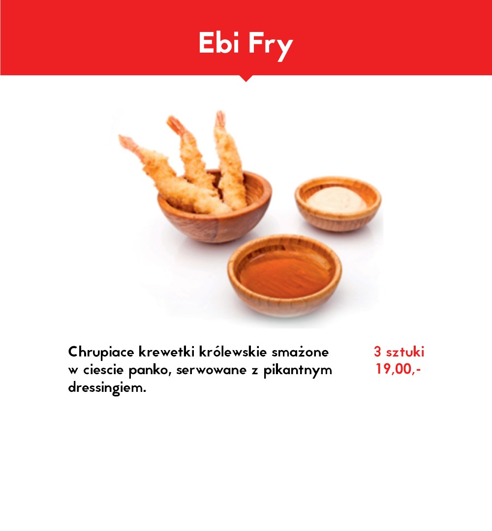 Trzy gunkany owinięte w omlet tamago z japońskim majonezem, chrupiącymi krewetkami oraz słodko pikantnym sosem. -