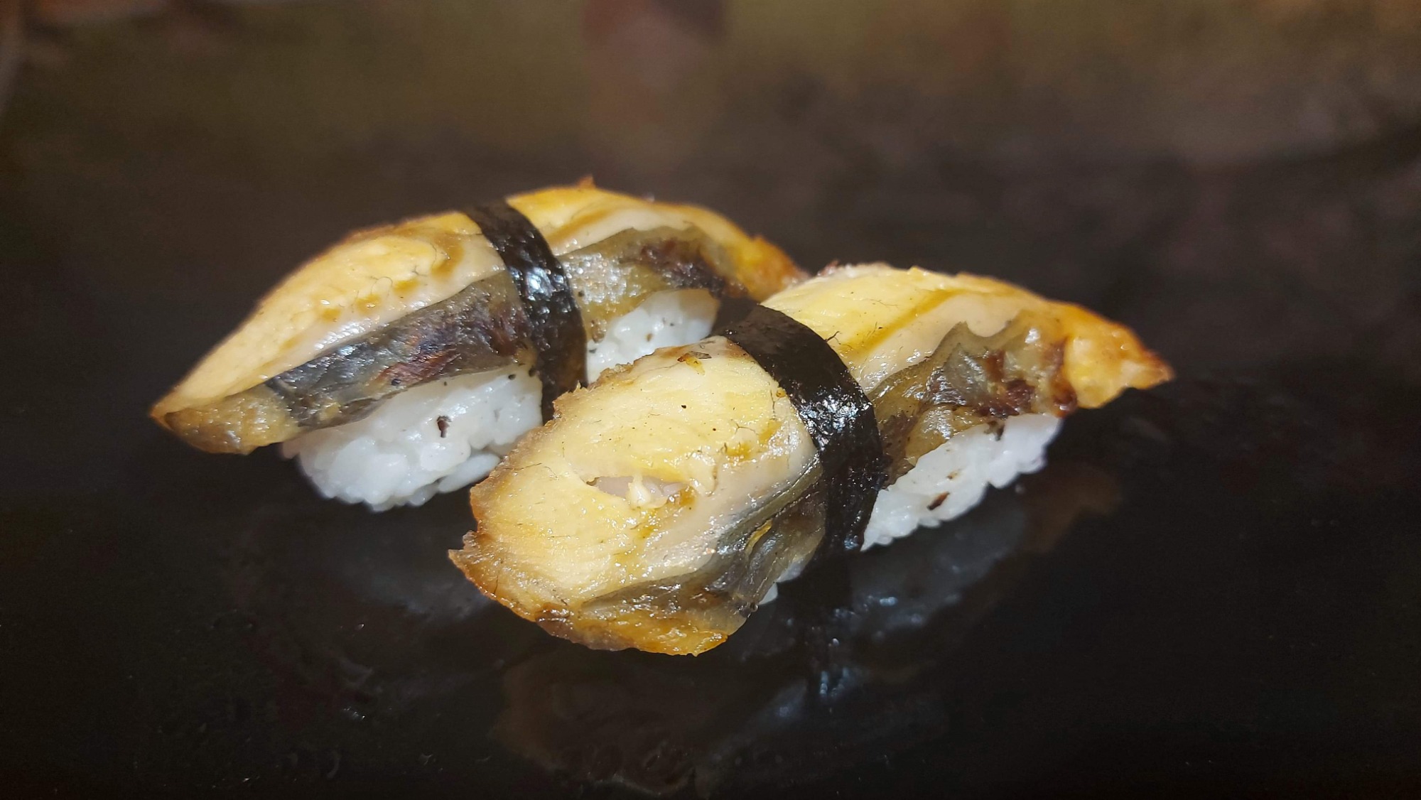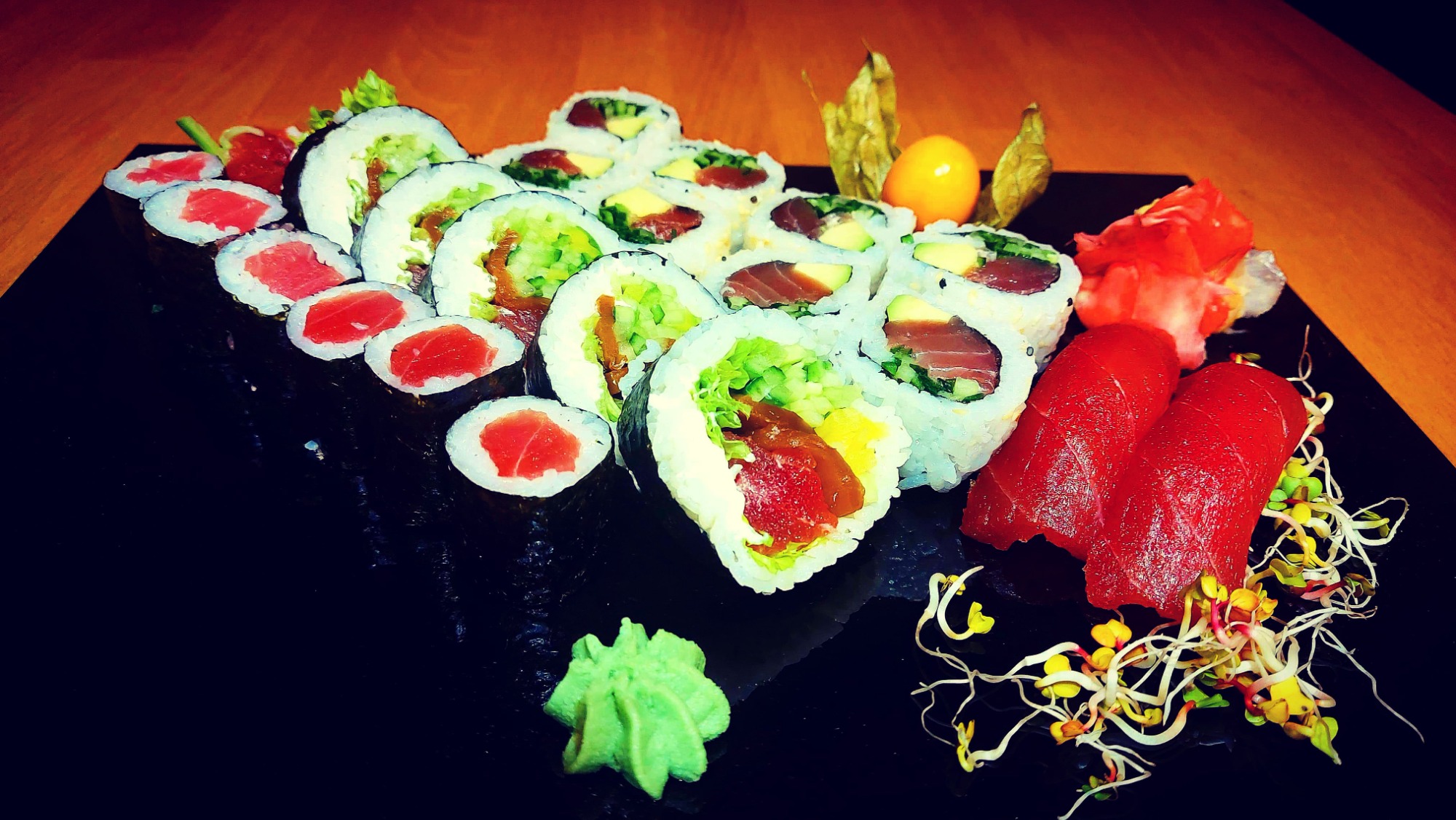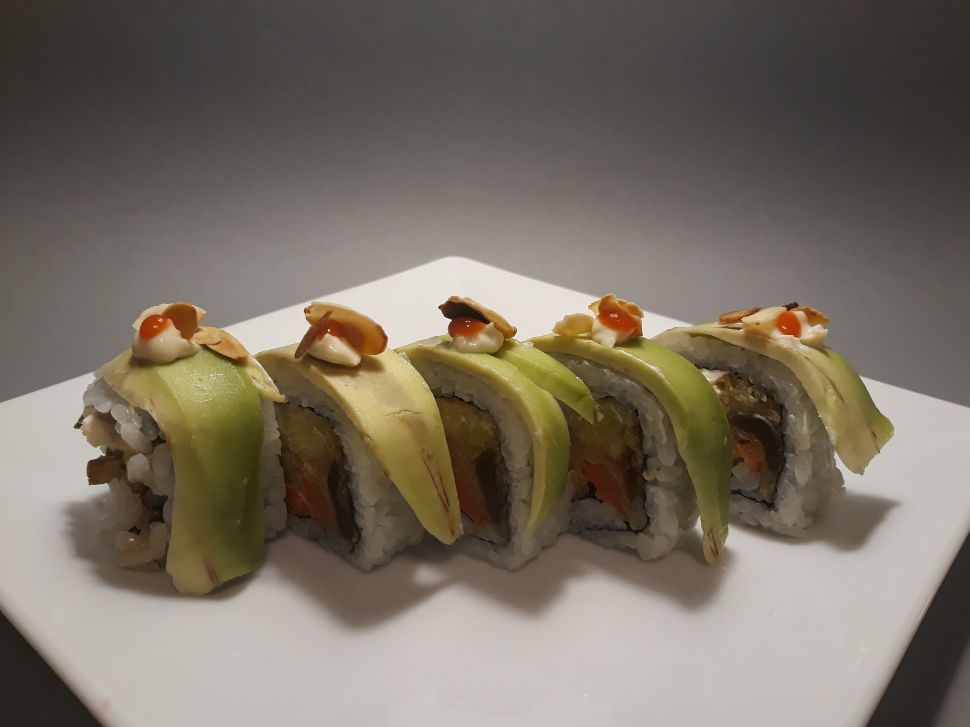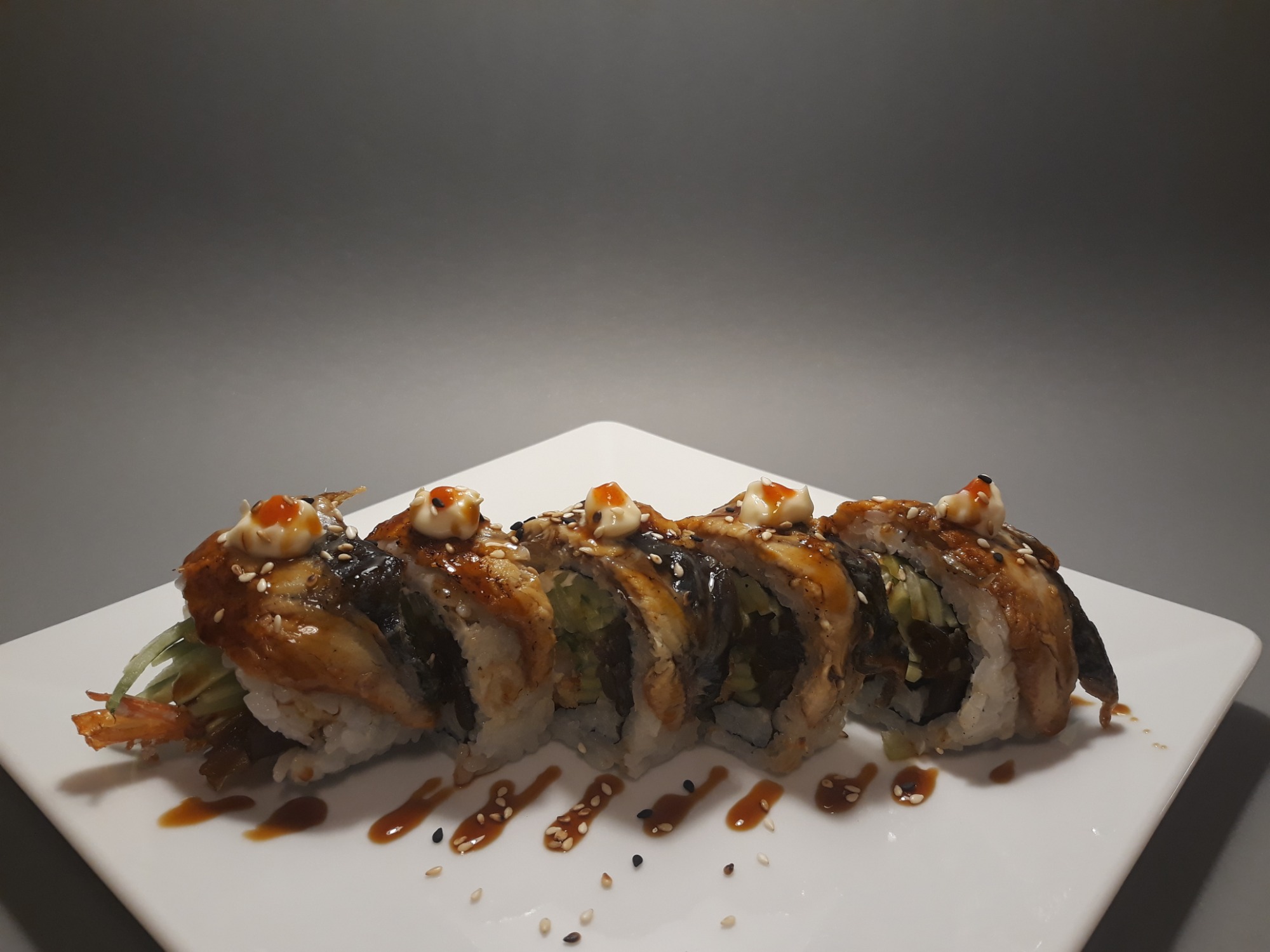krewetka w panko, serek , ogórek , tykwa, sriracha, togaraschi, rolka obłożona opalanym łososiem rybą maślaną, i tuńczykiem