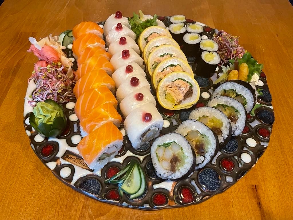 Futomaki łosoś 12 szt., Futomaki grillowany łosoś 12 szt., Philadelphia ryba maślana w tempurze 6 szt., Futomaki opiekane w panierce panko 6 szt., California pasta z tuńczyka 8 szt., California gold 8 szt., Tamago maki łosoś 6 szt., Futomaki krab 6 szt.,Hosomaki awokado 6 szt., Hosomaki ogórek 6 szt., Hosomaki łosoś 6 szt., Nigiri łosoś 4 szt., Nigiri ryba maślana 4 szt., Nigiri tuńczyk 4 szt., Nigiri omlet 4 szt., Gunkan pasta tuńczyk 4 szt.