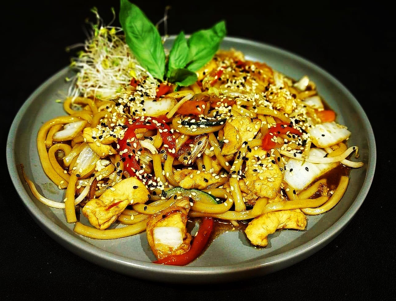 Smażony pszenny makaron udon z warzywami i tofu -