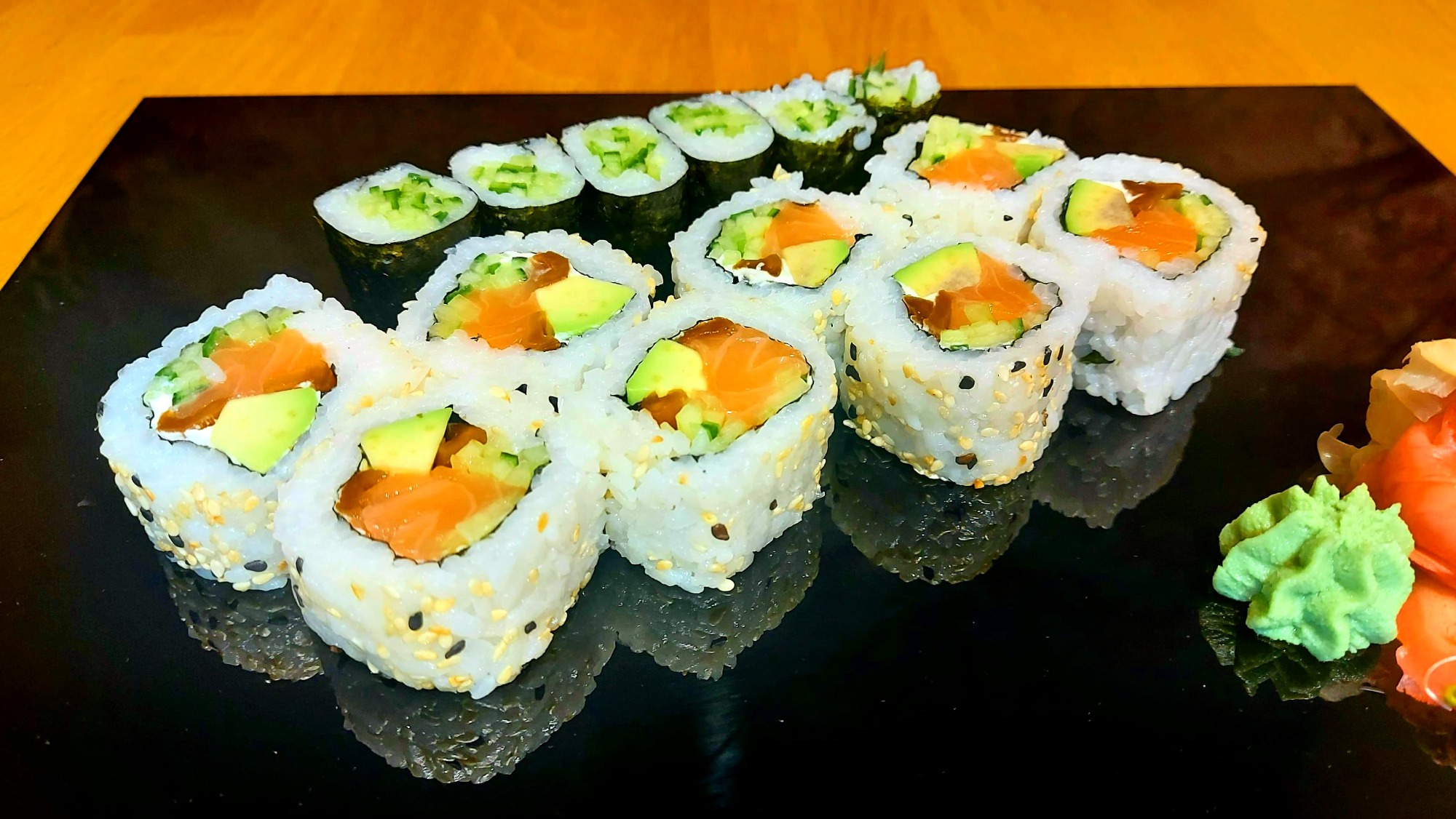 surimi, serek, awokado, ogórek, rolka obłożona łososiem rybą maślaną i tuńczykiem -