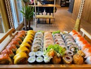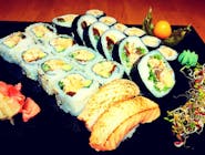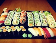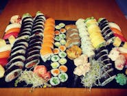 Zestaw 12 (102 szt.)Futomaki łosoś 12 szt., Futomaki grillowany łosoś 12 szt., Philadelphia ryba maślana w tempurze 6 szt., Futomaki opiekane w panierce panko 6 szt., California pasta z tuńczyka 8 szt., California gold 8 szt., Tamago maki łosoś 6 szt., Futomaki krab 6 szt.,Hosomaki awokado 6 szt., Hosomaki ogórek 6 szt., Hosomaki łosoś 6 szt., Nigiri łosoś 4 szt., Nigiri ryba maślana 4 szt., Nigiri tuńczyk 4 szt., Nigiri omlet 4 szt., Gunkan pasta tuńczyk 4 szt.