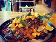 Łosoś Teryakipieczony łosoś w sosie teryaki, frytki z batata , sałata z dressingiem marchewkowo-ananasowym