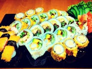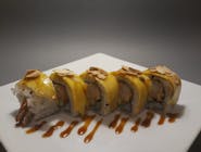 Gold Mango Salmon 10 szt.grillowany łosoś , serek ,awokado ,obłożone mango ,pulpa mango, teryak , migdały prażone