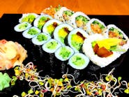 Futo Sashimi Roll 10 sztRolka bez ryżu wyłożona w środku 3 gatunkami ryb łosoś, ryba maśana, tuńczyk. W środku z surimi , serkiem, sałatą, ogórkiem , oshinko i awokado