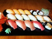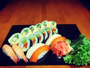 Zestaw 10 (69 szt.)Nigiri łosoś 3 szt., Nigiri tuńczyk 3 szt., Nigiri krewetka 3 szt.,Nigiri ryba maślana 3 szt.,Futomaki łosoś 6 szt., Philadelphia maki łosoś w tempurze 6 szt., Tamago maki pasta z tuńczyka 6 szt., Futomaki grillowany węgorz 6 szt., Hosomaki awokado 6 szt., Hosomaki łosoś na ostro 6 szt., California gold 5 szt., California krewetka w tempurze 5 szt., California łosoś z kawiorem na zewnątrz 5 szt., Futomaki ryba maślana 6 szt.