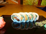 Łosośrolka w tempurze, serek, ogórek , awokado, oshinko. 6 szt.