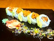 Futo Kami Salmon Rroll 10 szt.Futomaki z sałatką krabową na ostro , obłożone plastrami łososia , kawior