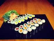 Zestaw Weekendowy 60 szt.California chrupiąca krewetka obłożona tatarem z łososia 8 szt, Futomak ryba maślana w tempurze 6 szt, California surimi obłożona krewetką i tobiko 8 szt, Futomak z kalmarem w tempurze 6 szt, California grill łosoś obłożona mango 8 szt, Tamago grillowany łosoś 6 szt, Futomak łosoś 6 szt, Hosomak ogórek 6 szt, Hosomak tykwa - rolka w tempurze 6 szt.
